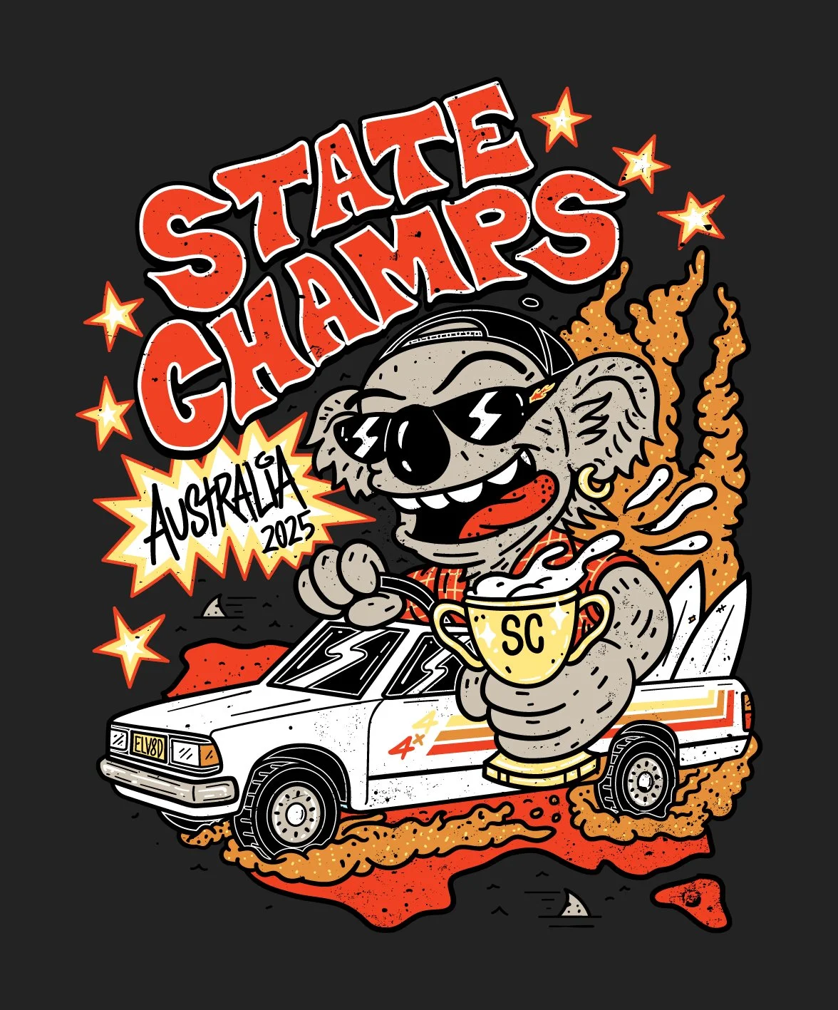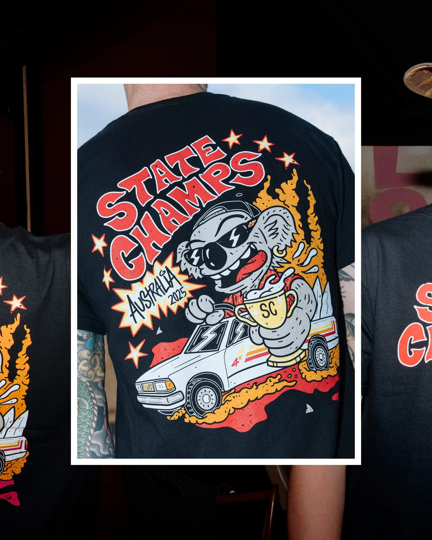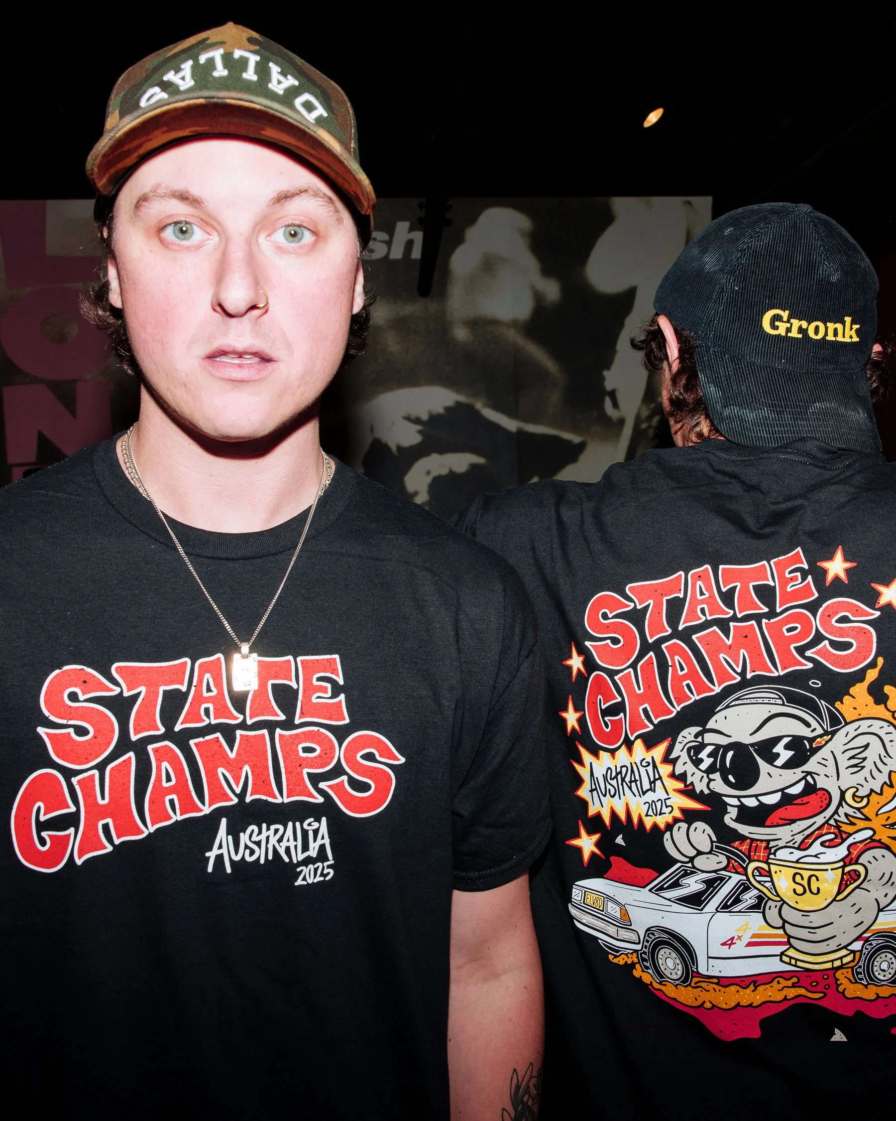 Custom merch for US pop punk legends State Champs on their 2025 Australian tour with Neck Deep.